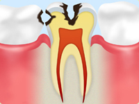 | 症状 | エナメル質の内側にある象牙質まで虫歯が進行した状態。 冷たい物や甘い物がしみるようになり、ときどき痛むこともあります。 |